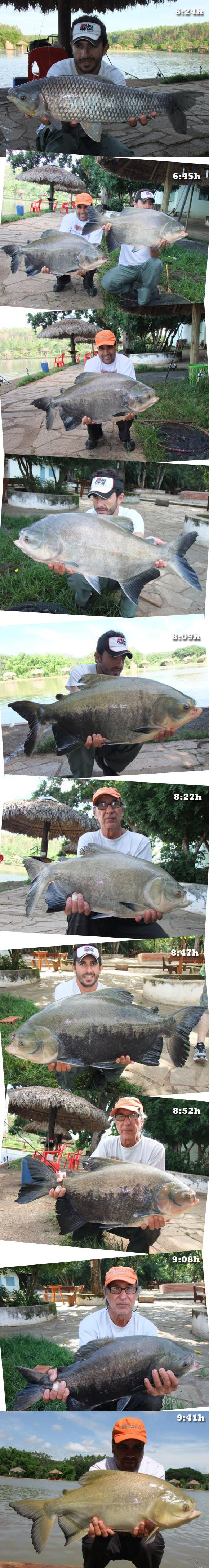 Após um rápido e merecido descanso, acordarmos bem cedo e ao amanhecer estávamos de volta à beira do Lago principal e com os aeradores ainda em funcionamento iniciamos a pescaria na modalidade cevadeira e com apenas algumas “copadas” os redondos emergiram e começaram atacar a ceva na superfície. Observamos um grande cardume de grandes peixes e para não perder o costume, muitas fisgadas, com brigas intensas e muito peixe na foto. Iniciamos o dia com chave de ouro!!!