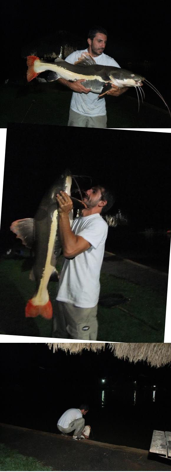 Bastou escurecer para as cachapiras ficarem doidas na margem. Montamos dois equipamentos com a salsicha flutuando. Jogávamos aração e era só esperar os bigodes aparecerem e apernas abaixar a salsicha na água. Era fatal. A Lú teve mais sorte, abaixou a salsicha literalmente na boca de uma delas que abocanhou sem pensar. A fisgada foi certeira e a pequena varinha estava envergada no limite. Mais uma boa briga da Lú com a Cachapira, esta bem maior que as outras.