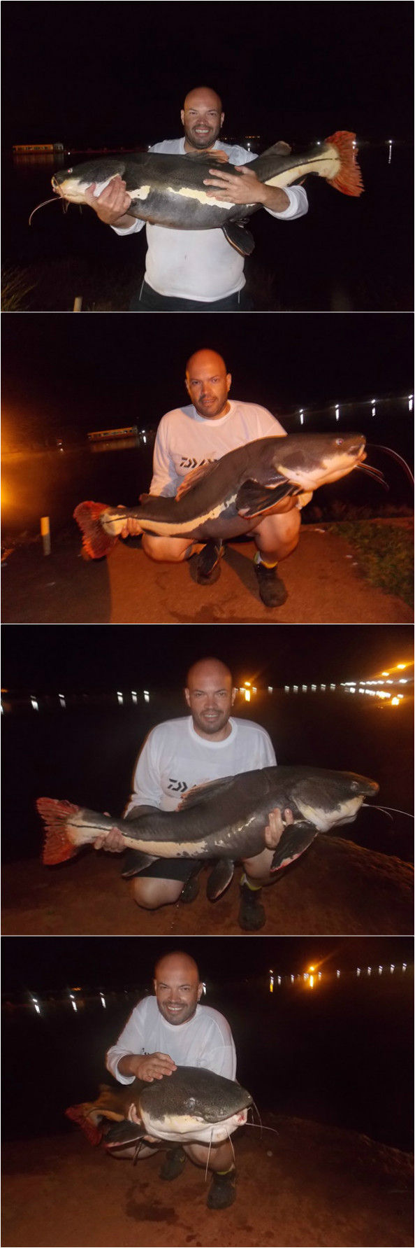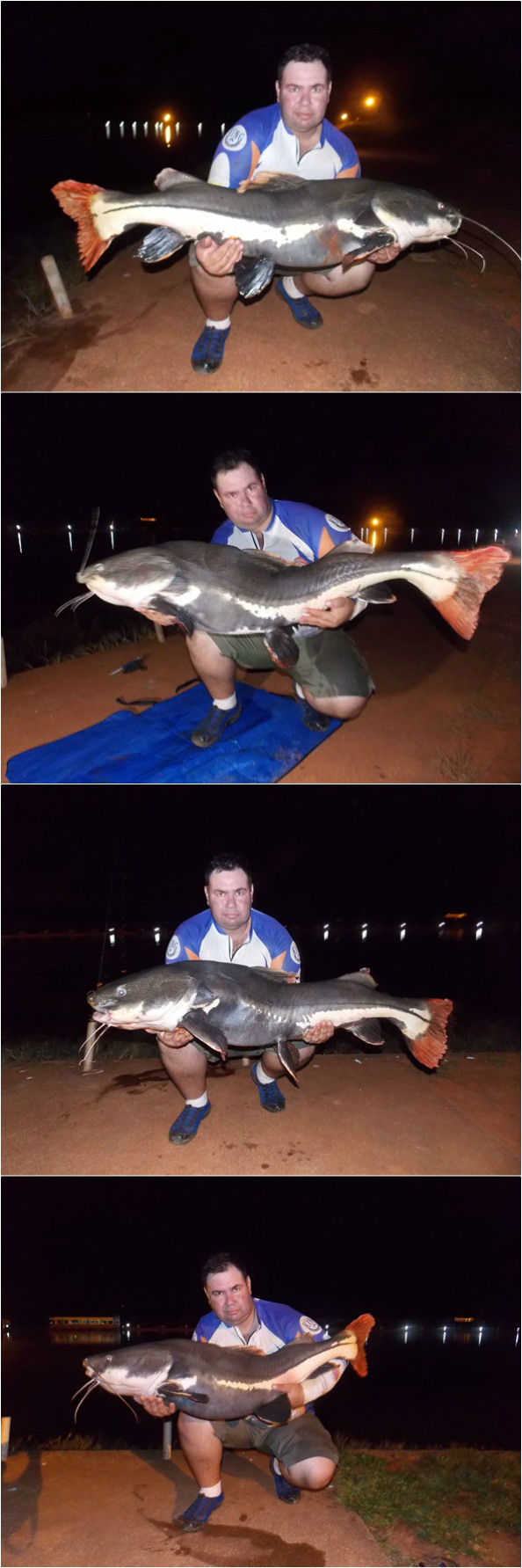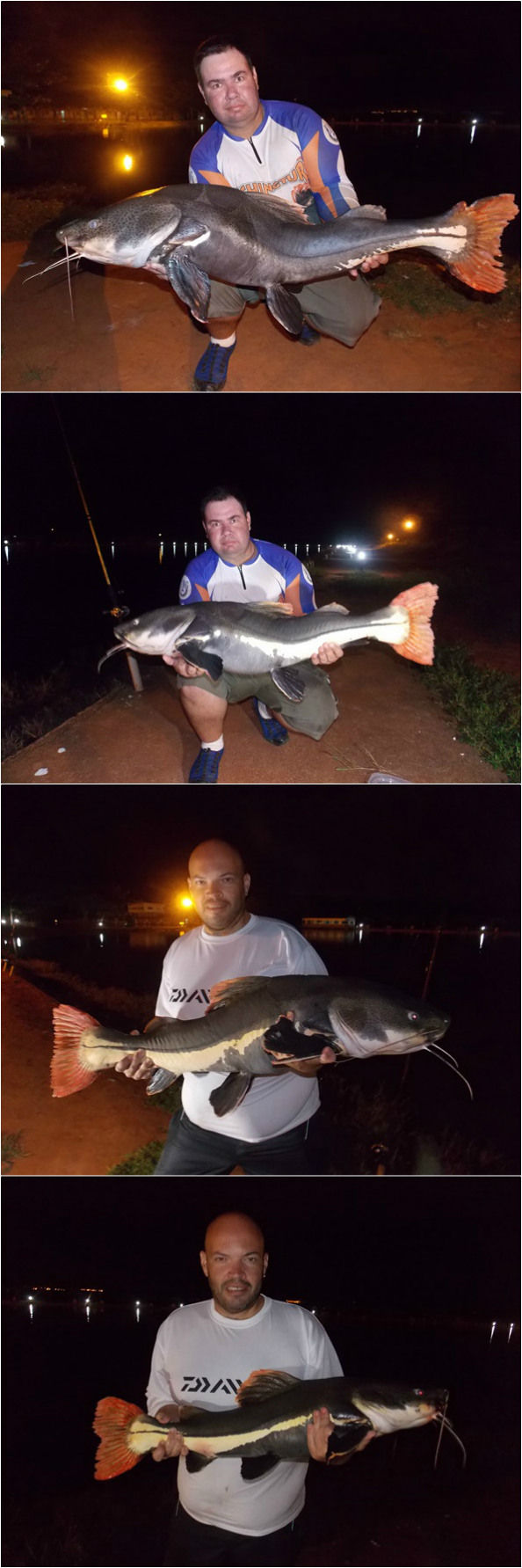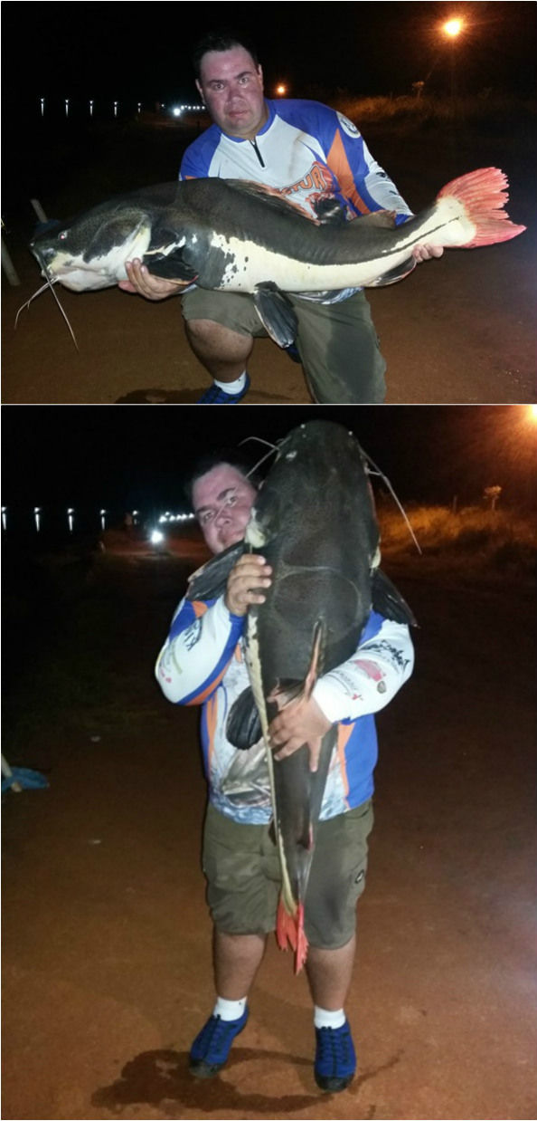 Uma delas foi a maior pirarara que já vi pessoalmente, é difícil dizer mas acredito pesar uns 50 Kg, pois medimos e deu 1,5 mts e eu não conseguia carregar ela devido ao peso e por eu já estar exausto pela briga. Estávamos exaustos, fui recolher as varas para encerrar mais uma noite e quando fui pegar a última vara, mais uma pira puxa hehe, tamanho mediano mas bem bonita.