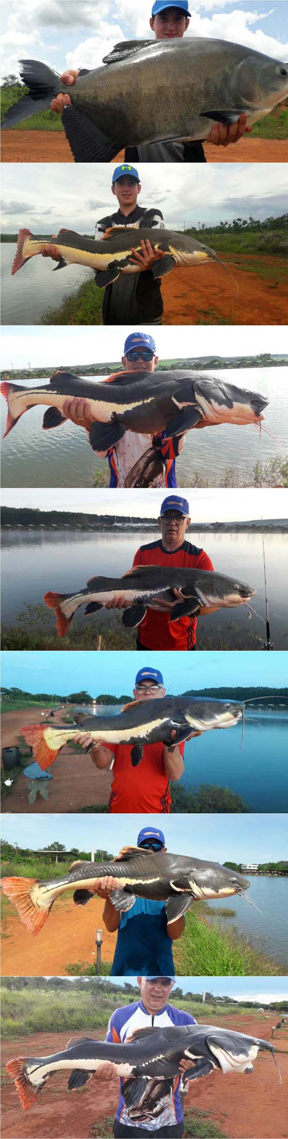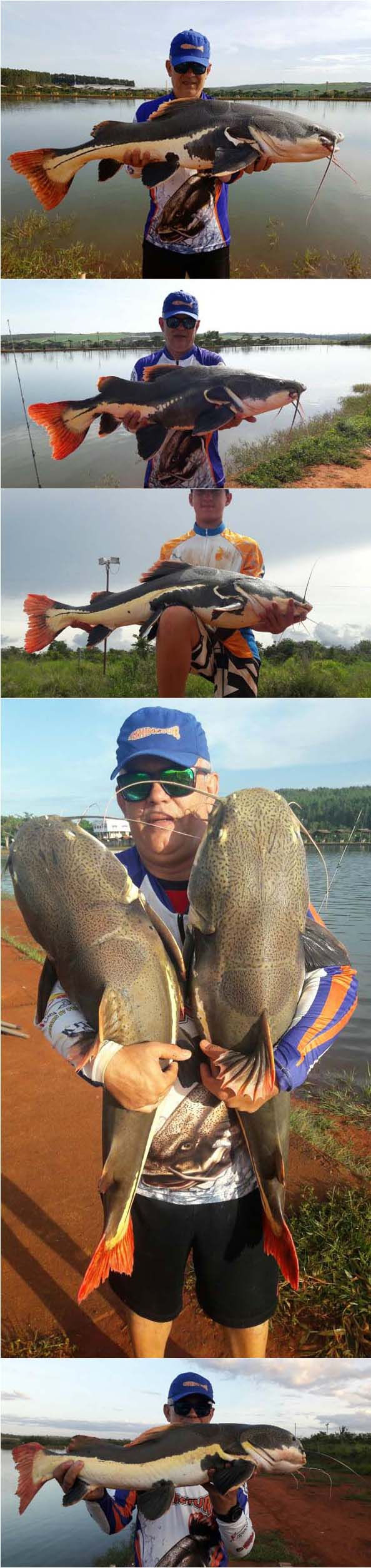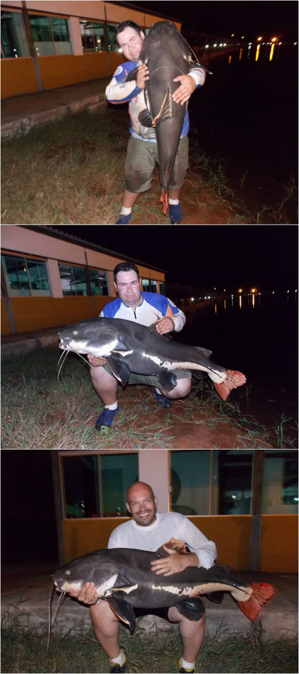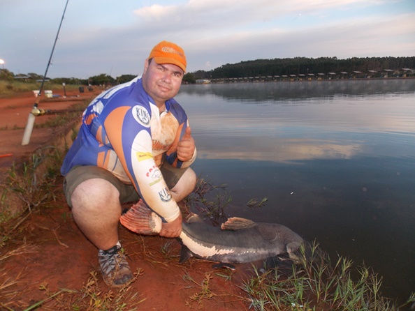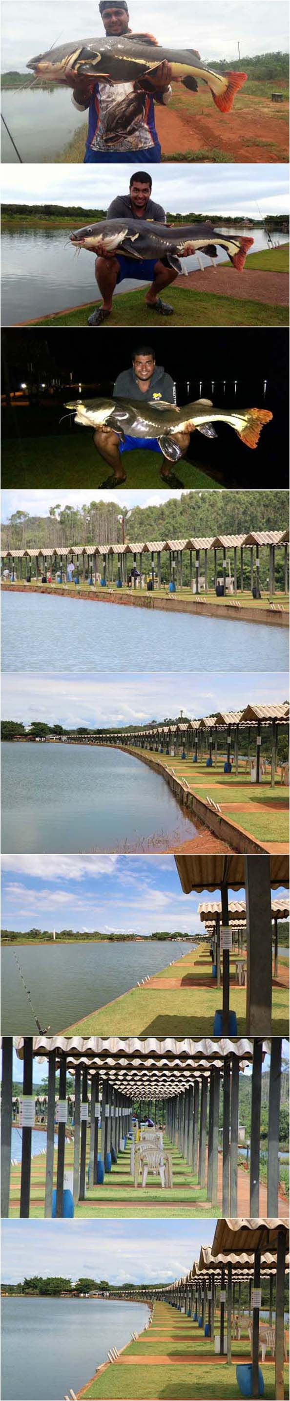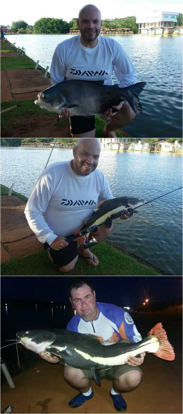 Olá amigos! A pescaria dessa vez foi num pesqueiro que esta sendo reconhecido nos dias de hoje como um dos melhores do Brasil para a pesca das briguentas pirararas, o Clube Pescar do nosso amigo Cássio, localizado em Luziânia, pertinho de Brasília cerca de 60 km. Pescaria realizada nos dias 28.01 a 01.02.17 Nessa pescaria estávamos eu (Márcio) e meu amigo Alexander(Alex), nós dois já havíamos pescado nesse pesqueiro na mesma época do ano passado e como na primeira vez nós fizemos uma excelente pescaria, dessa vez estávamos ainda mais animados pois já conhecíamos o pesqueiro e seu potencial e dessa vez já com um pouco mais de conhecimento do local, o que acho muito importante para cada vez ter mais resultados, estávamos ansiosos sabendo que essa pescaria prometia e muito. Chegamos no pesqueiro no Sábado por volta das 13 horas. Tínhamos em mente chegar esse horário nos acomodarmos, montar as varas tranquilamente e começar a pescaria somente a noite. Eu fui com a finalidade de pescar somente pirararas e o Alex ia pescar também um pouco de tambas no lago de frente das acomodações. Alex vendo o quanto os peixes estavam ativos rebojando muito na superfície e vendo os pescadores que já estavam ali pegando muito não resistiu e começou a pescar. Usando cevadeira e como isca a goiabada, era um tamba fisgado a cada arremesso porém não eram grandes. Ele armou também um equipamento leve com salsicha de fundo atrás das pequenas pirararas que haviam sido soltas nesse lago, cerca de 200 unidades. São pequenas mas com material leve se torna uma pescaria divertida.
