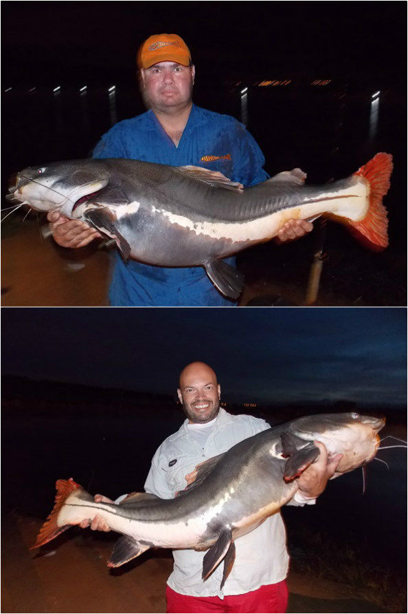 Foi amanhecendo o dia, a noite já tinha sido ótima mais o melhor estava por vir...dois alarmes tocam e ambas tomando linhas loucamente com as varas ainda nos suportes denunciando serem duas brutas. Após muita briga de ambas, elas se atracaram e foi uma imensa felicidade pois eram duas monstras passando facilmente dos 40 kg. Dublê de piras desse porte parecia um sonho rs...
