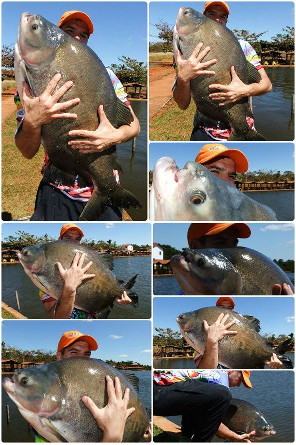 Depois de inúmeras capturas fomos olhar as varas de pira que estavam todas armadas no lagão, e adivinhem o que aconteceu ? Quando cheguei me deparo com minhas 2 varas literalmente bebendo água, então o jeito foi chamar o Saulo para vir me ajudar á tirá-las e foram vários minutos de briga até que a minha Pirarara encosta na margem, imediatamente o Marcio já dispara um flash meu apontando para ela, e logo a do Saulo já encosta também, e aí demos conta do seu tamanho. Se tratava de uma pira gigantesca. Olhem a sessão de fotos que fizemos com esse dublê que com toda certeza corôa o Clube Pescar com um dos melhores pesqueiros do Brasil.