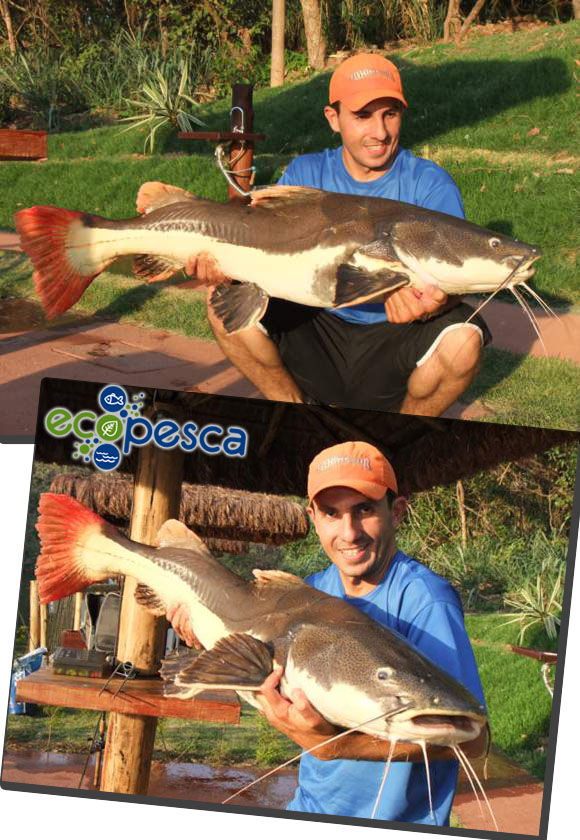 Comendo as ração que ficam encostadas no barranco, dezenas de grandes Jundiás, praticamente em nossos pés. Bastava descer uma salsicha, fisgar e ter uma boa briga. peixe de pouco tamanho, mas com muita força. Esse é o Jundiá-Onça ou Jundiara, híbrido resultante do cruzamento do Jundiá Amazônico com o Pintado/Cachara.