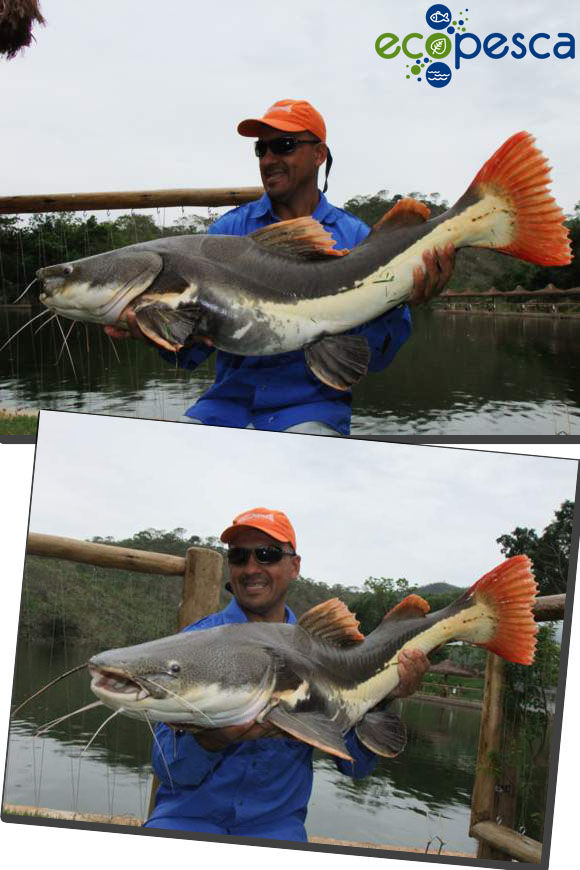 Parece história de pescador, mas o Júnior estava lavando as mãos quando o outro equipamento envergou e o alarme disparou, desta vez uma corrida mais lenta e constante, puxando metro a metro da linha da grande carretilha. Sabíamos que era um exemplar maior do que o outro pelo tipo de puxada. Uma briga sem rápidas corridas, mas puxadas longas e com muito peso. O peixe desfilou pelo meio do lago, mas retornou rápido para a margem ou realmente começou a brigar, era o júnior de um lado tentando erguer o peixe e a Pirarara de outro levando tudo para o fundo. Depois de cansar e muito o braço o grande rabo vermelho apareceu a uns 3 metros de profundidade. A água no Eco Pesca é muito limpa, possibilitando que o pescador veja o peixe mesmo a metros de profundidade.