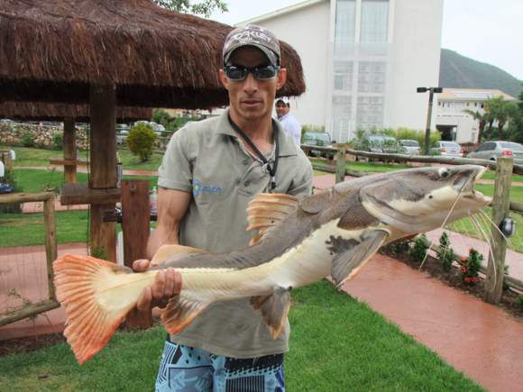 Novamente mudei de modalidade, montei uma vara de 25 libras, carretilha de perfil baixo com linha 0,37mm. Coloquei uma Boia cevadeira Barão, chicote de 2 metros de linha mono 0,45mm, boinha e um anzol de robalo com 2 eva's caramelos e uma miçanga branca. Bastaram alguns arremesso para ver um boa quantidade de redondos, entre eles alguns grandes exemplares se alimentando. Em um dos arremessos minha boinha começou e nada no sentido oposto a ceva, não pensei duas vezes e fisguei. O peixe saiu em disparada cortando o lago para a direita em grande velocidade e de repente voltou para a esquerda rapidamente, tomando linha e indo para o barranco da margem lateral, uma briga forte mas com corridas muito rápidas, coisa não muito comum nos grandes tambas. A essa altura do campeonato o peixe estava brigando na outra lateral do lago, isso a uma distância de uns 70 metros de onde eu estava. Em certos momentos chegou a quase se enroscar no capim, sabíamos que não era mais um tamba e que se tratava de um peixe de couro, mas fisgado na miçanga. Aos poucos consegui dominar a situação e aos poucos o peixe se rendeu. Era uma bonita Pincachara.