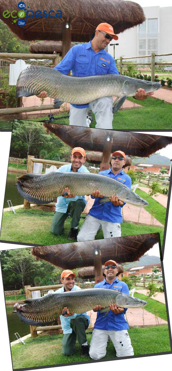 O café da manhã já estava sendo servido, então decidimos primeiramente saborear as guloseimas da refeição matinal no Hotel Turismo que fica a menos de 100 metros do lago de pesca. Vocês poderão acompanhar tudo sobre as hospedagens e nossas refeições em uma próxima matéria. Totalmente satisfeitos, retornamos para o Eco Pesca, onde nosso amigo André (proprietário) já nos aguardava. Pegamos nossos equipamentos e antes mesmo de começar a arrumar minha tralhas, o Júnior que estava com uma vara de 60 libras com carretilha e linha 0,62mm, arremessou uma cabeça de tilápia bem na saída de água, contou até três e fisgou. A impressão que tive é que o peixe estava de boca aberta esperando a isca cair na água. Rapidamente a vara de ação pesada envergou ao extremo e uma forte tomada de linha nos chamou atenção, pensamos ser uma boa Pirarara, mas neste instante a linha subiu e um gigantesco Pirarucu saltou quase um metro para fora da água, balançando a cabeça tentando se livrar do anzol. Olhei para a cara do Júnior e eles estava anestesiado coma cena, afinal era um Pirarucu muito grande que facilmente passava dos 40kg. Esse peixe brigou demais, usando a sua força e o seu peso contra o pescador, foram minutos conflitantes de adrenalina, medo, angústia e alegria, até que o gigante entrou no passaguá e o sorriso, um sincero e confortante sorriso apareceu em nossos rostos.