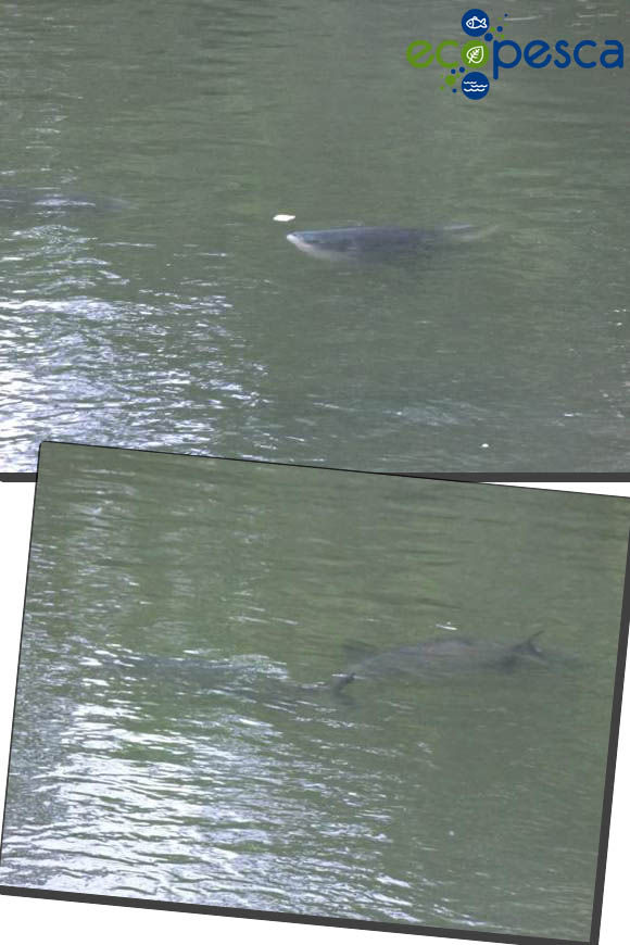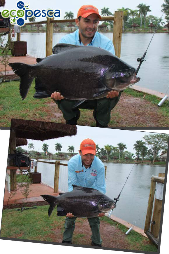 Depois de uma ótima noite de sono e depois de uma espetacular pescaria em nosso primeiro dia no Eco Pesca, acordamos bem cedo e antes mesmo do café da manhã, já estávamos na beira do lago. Assim que chegamos, bem na entrada de água(quente) notamos muitos mas muitos peixes desfilando de um lado para outro. Eram Tambacus, Jundiás e até Pirarucus. Peguei então uma bolacha que estava no chão e joguei na água, bastou apenas isso para ver dois grandes Tambacus subindo e abocanhando a bolacha. Foi inacreditável e eu ainda consegui fotografar a cena.