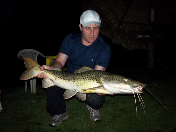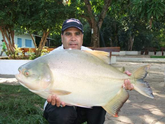 Diante das rápidas capturas de 3 Pirararas seguidas, começamos a cevar em busca também dos tambas, utilizando chicote com guabizão e “beijinho” com chicote de 50 cm, mas os tambas estavam muitos manhosos e o Marcio observou um movimento na margem oposta do lago e arriscou ser as Cachapiras e rapidamente preparou um equipamento com Salsicha boiando e foi até o local deixando um equipamento bem rente a margem.....antes de retornar ao nosso QG, observei o luminoso da vara quase dentro d’água e o Marcio retorna em disparada e após travar uma boa briga o lindo peixe vem para foto e eu vou de carona.