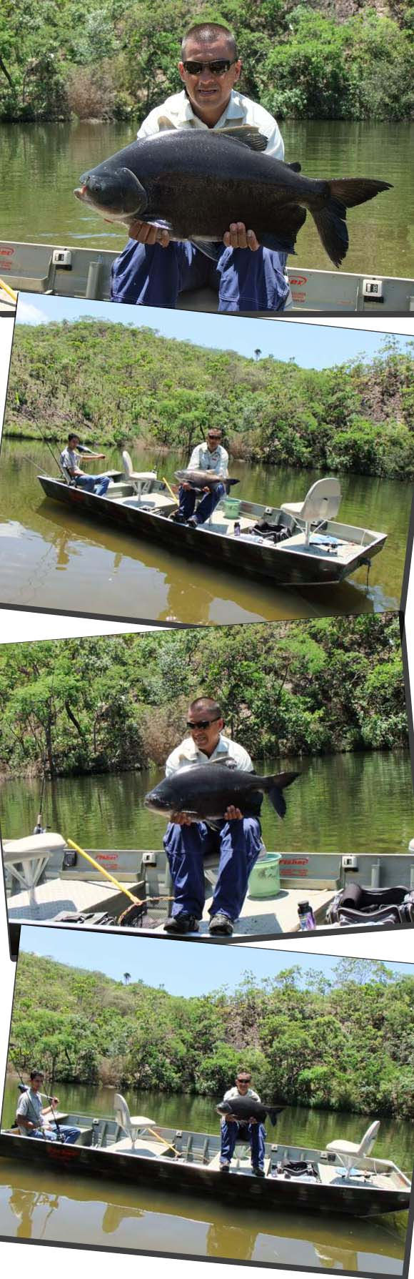 Deixamos a pescaria dos peixes de couro de lado para investir nos grandes Tambacus. Passamos pelo meio do lago e jogamos um pouco de ração, seguimos e apoitamos o barco na outra margem. Munidos de bóias torpedo com chicotes de 1 a 3 mts e como isca a ração Guabizão, fisgamos uma série de redondos.