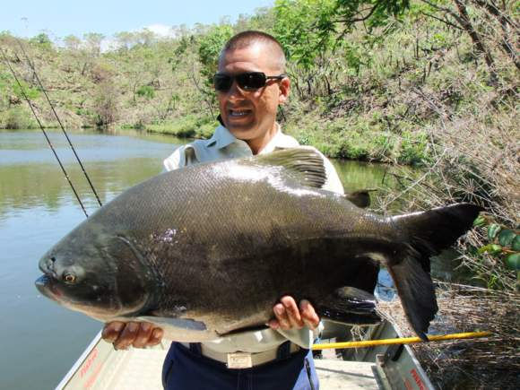 Ainda no chicotão e com a ração, agora foi a vez de um pequeno tambaqui dar as caras. Até mesmo este pequeno exemplar foi capaz de envergar a vara e tomar linha. Força como destes peixes a muito tempo que não vejo.