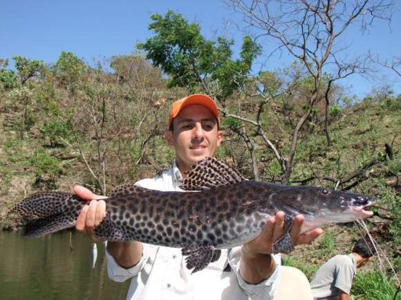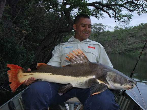 Já em outro ponto, foi a vez de minha vara envergar e disparar o alarme, mas uma corrida curta. Peguei a vara, fisguei e uma briga forte mas com corridas rápidas de um lado para outro denunciava ser outro peixe de couro e não a esperada pirarara. E acertamos, era um bonito e chamado por aqui de Caparari do Araguaia. Fisgado com uma cabeça de tilápia.