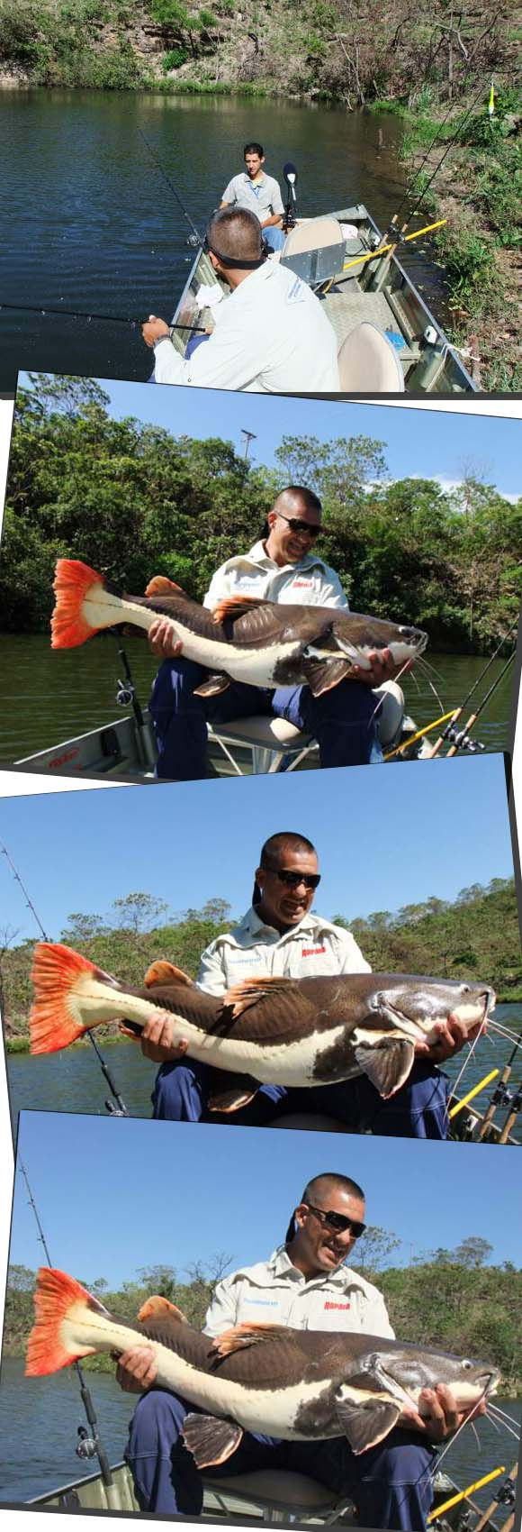 Minutos depois novamente assustamos quando o alarme de outra vara disparou. O peixe nadou rápido demais pela lateral do pedra, passando a linha por trás das pedras. Tivemos que soltar o barco e calmamente passar por cima do pedral, desenroscando a linha e depois sim brigar com o peixe que já estava a mais de 50 metros longe dali. Era outra bela Pirarara.