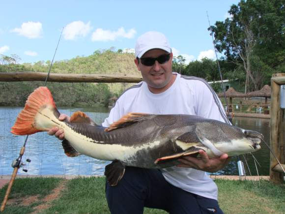 Nosso amigo Gilson que trabalha no pesqueiro fisgou mais uma Pirarara e saiu para a foto com a Bruta.