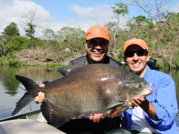 Equipamentos de Pirararas na espera e cevadeira e chicotão com “guabizão” no meio do lago e mais um bonito tambacu na foto.